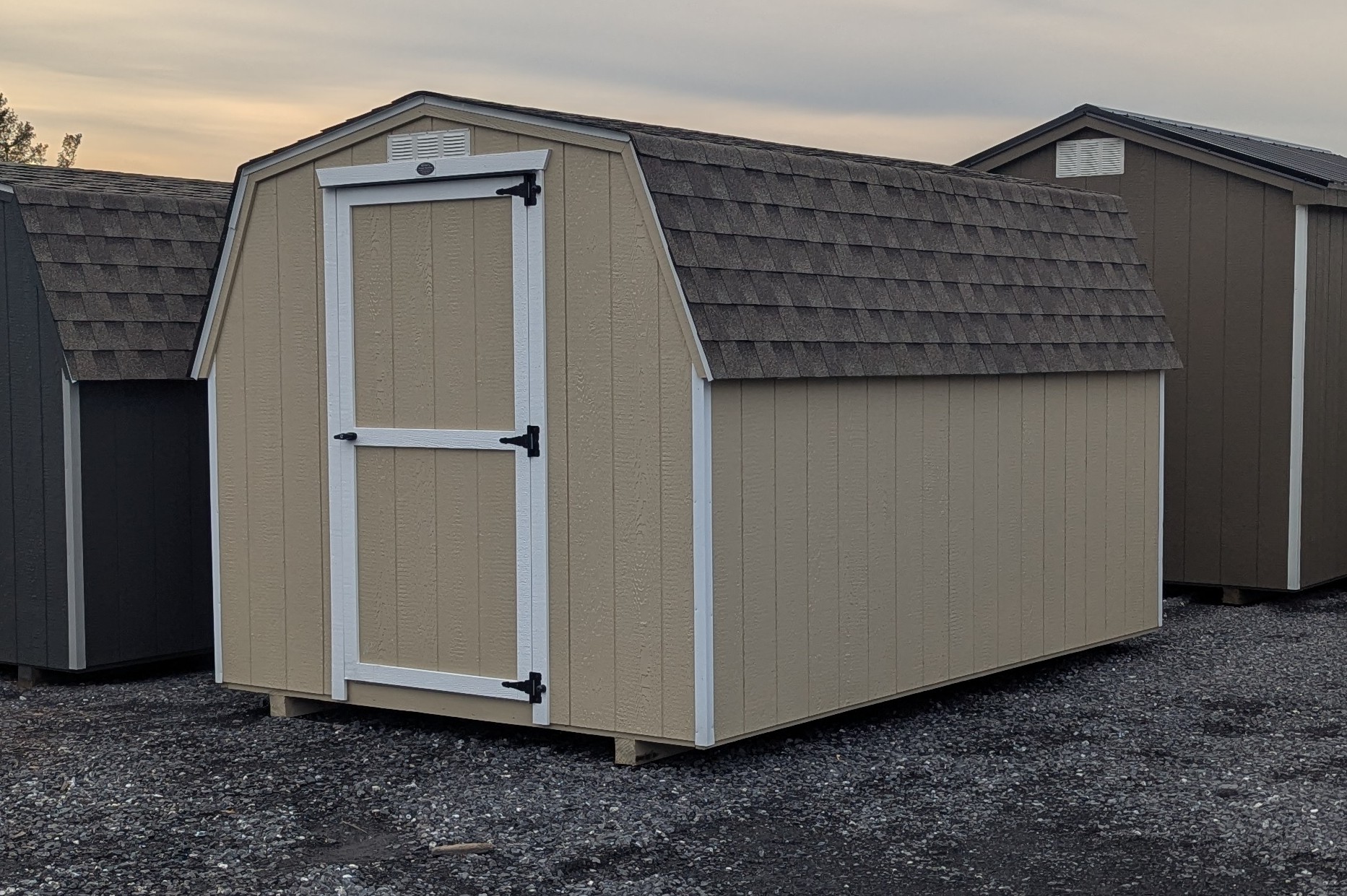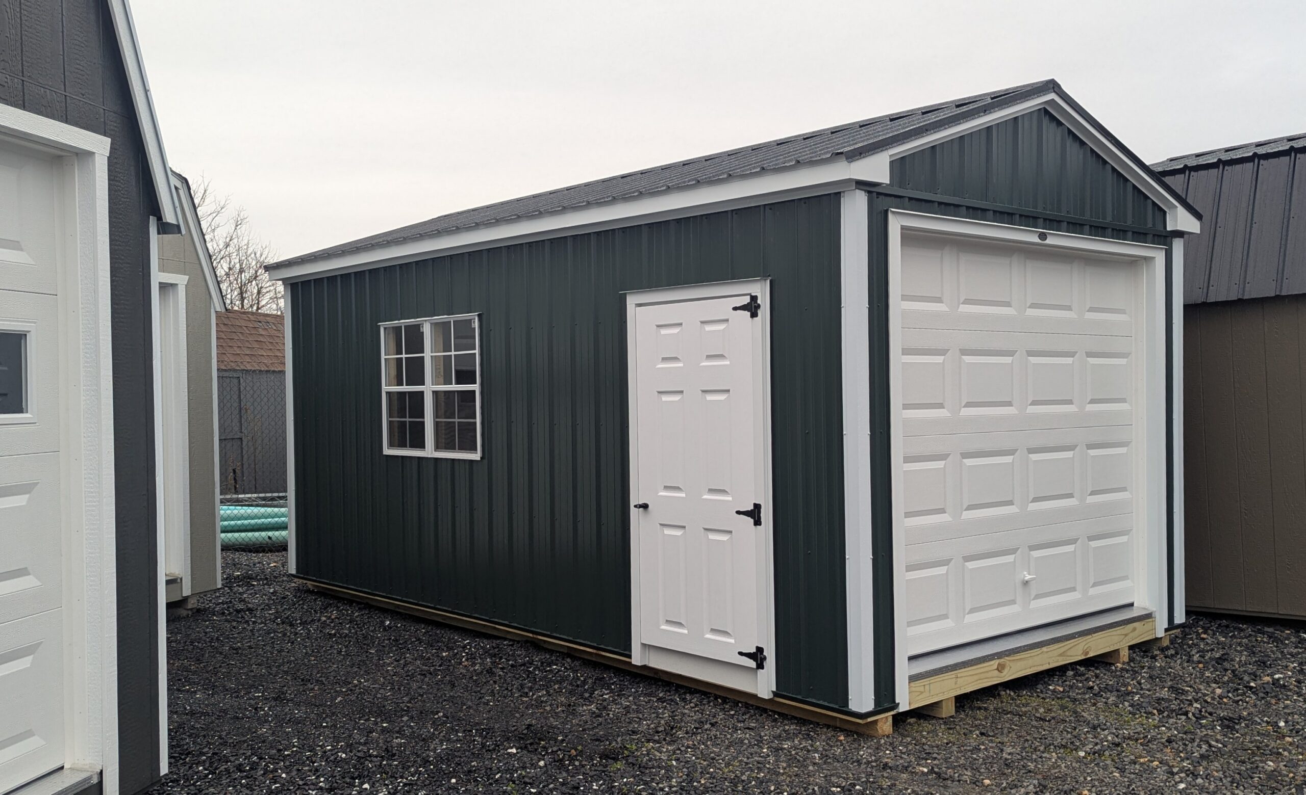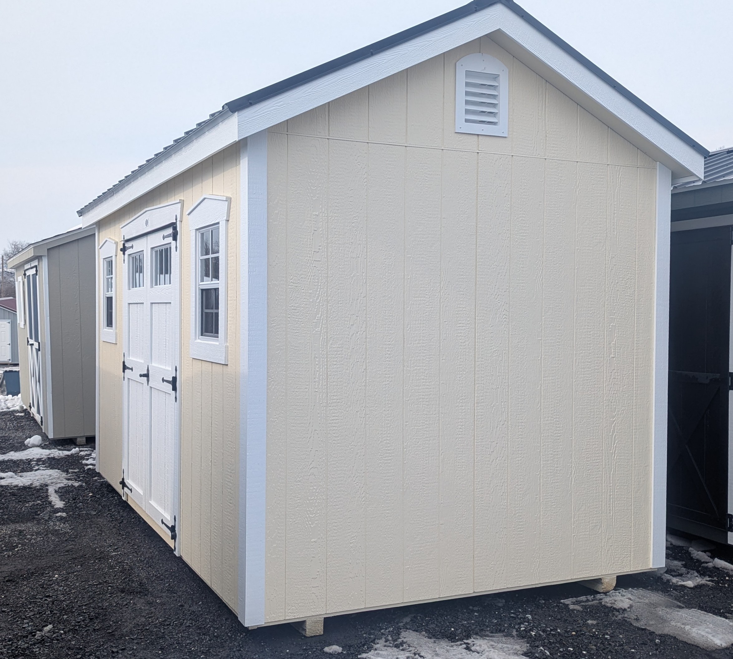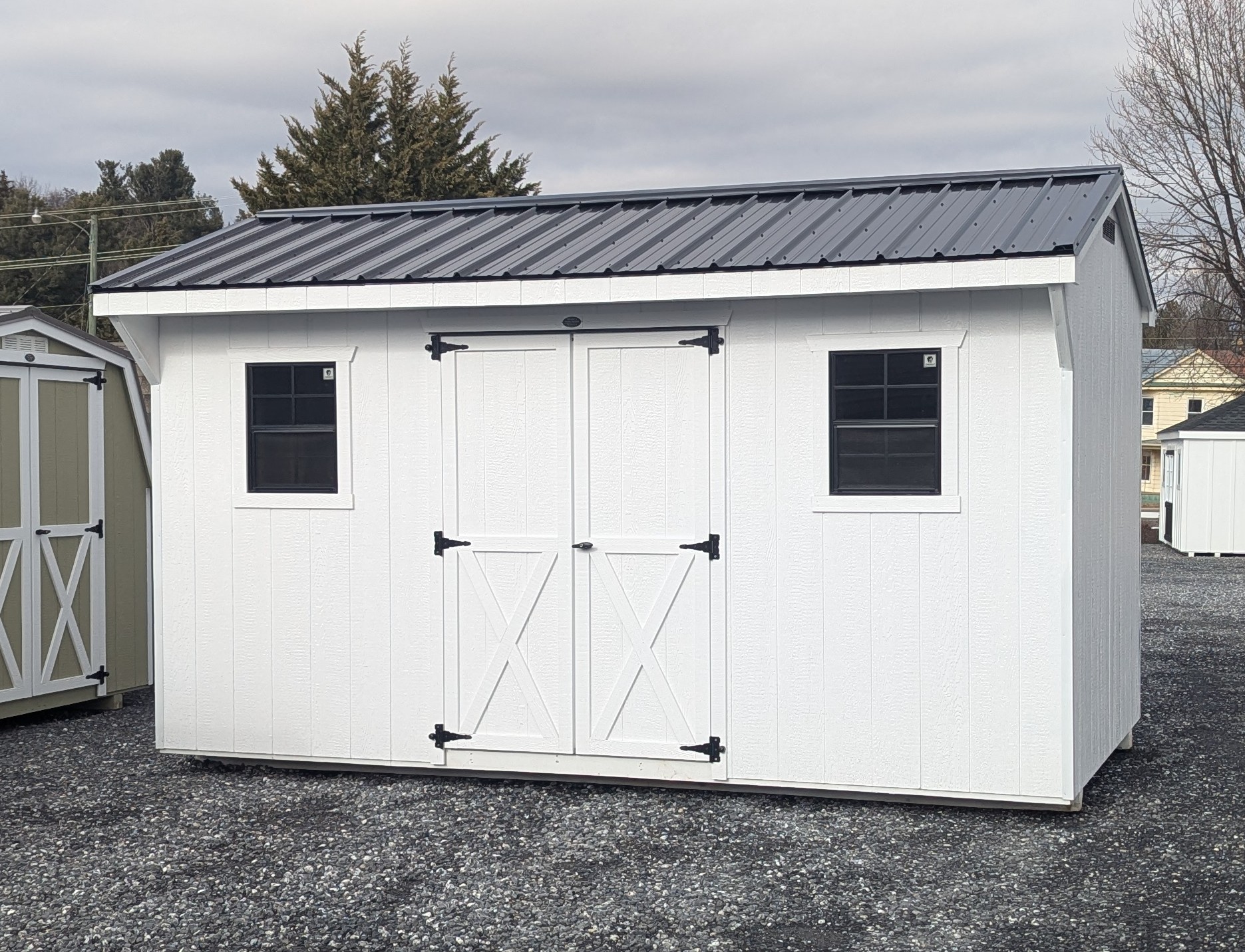 Gable vents, metal roof, only 1 window (2'x3'), window trim, shelves, transom double door upgrade