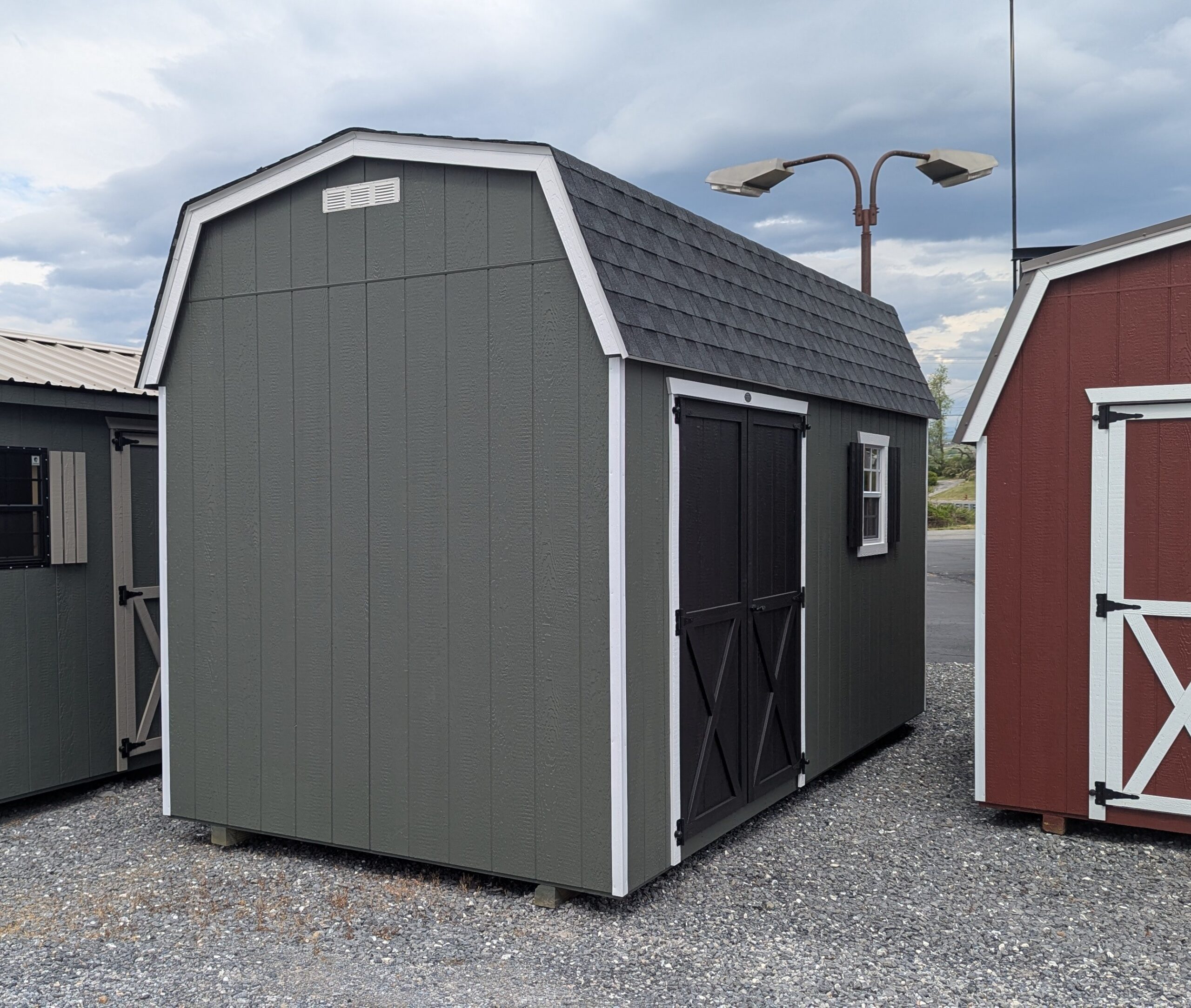 Gable vents, metal roof, 9'x7' w/glass, reinforced floor, 4' loft, 2'x3' window, window trim, double doors