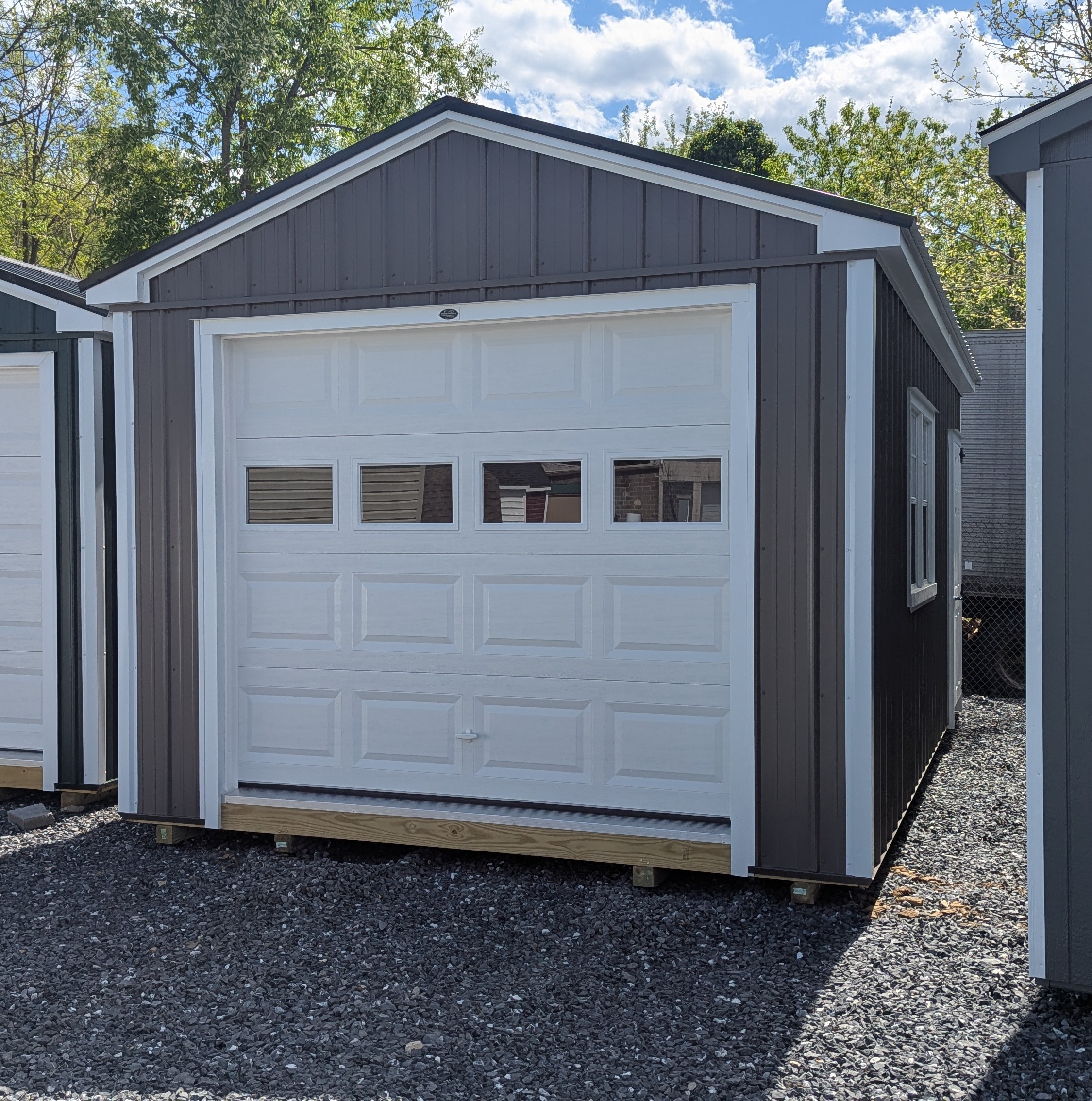 Gable vents, metal roof, only 1 window (2'x3'), window trim, shelves, transom double door upgrade